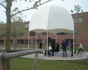 De basis van de overkapping wordt gevormd door een metalen frame (wit gecoat) dat is opgebouwd uit zes buizen die in de top met elkaar zijn verbonden. Het frame wordt overtrokken met wit – lichtdoorlatend- zeildoek (gecoat). Hierdoor ontstaat er een lichte koepel constructie die door de schaduw van de bomen op het doek constant van gedaante verandert en qua vorm aansluit op de omgeving en de Gaudi-bank.