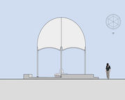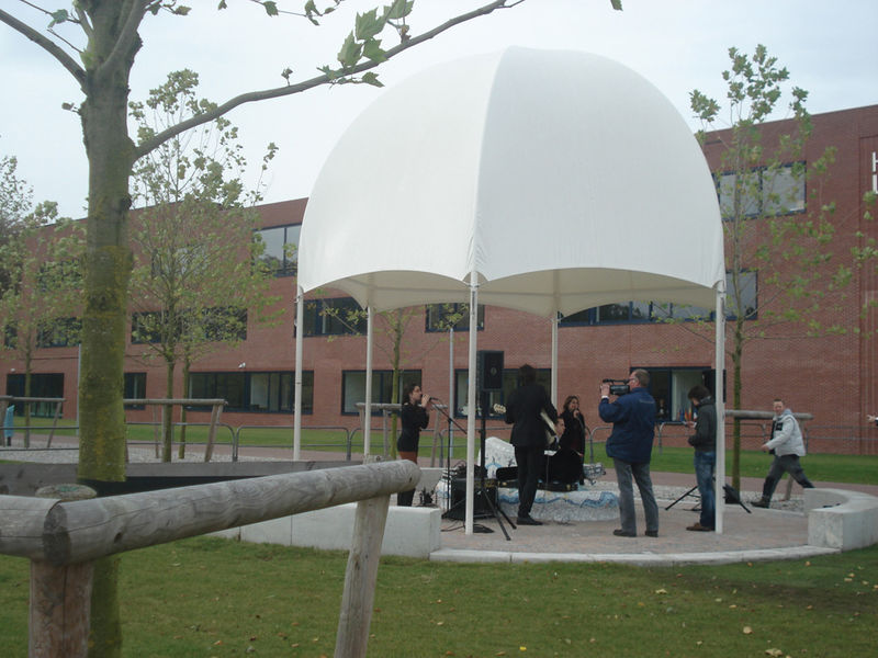 Het paviljoen wordt op een rond plateau geplaatst. Het plateau wordt met een brede betonband omzoomd en ingevuld met granietkeitjes. In het plateau worden grondspots opgenomen die de koepel van onder aanschijnen. De koepel verandert hierdoor ´s avonds in een lichtbaken tussen de bomen.