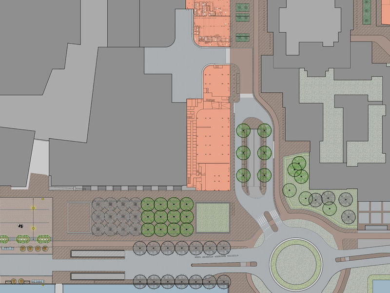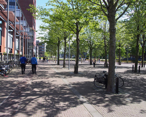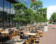 Aansluitend aan het bioscopencomplex is ruimte voor horeca terrassen. Om de verblijfskwaliteit van het plangebied en ruimtelijke relatie tussen de twee pleinen te vergroten zijn er bomen aangeplant; voor de bioscoop geschoren boomblokken (plataan) en langs de entree van de parkeergrage losgroeiende bomenrijen (plataan). De boomblokken zijn afgestemd op de gevelindeling van het Paradisocomplex (breedte en hoogte) en verbeteren het microklimaat (windluwte) van de doorgang.