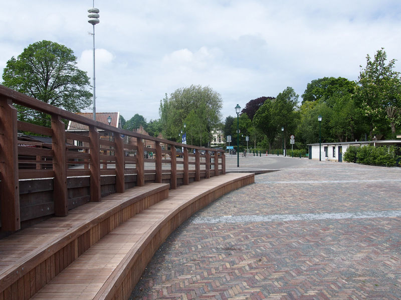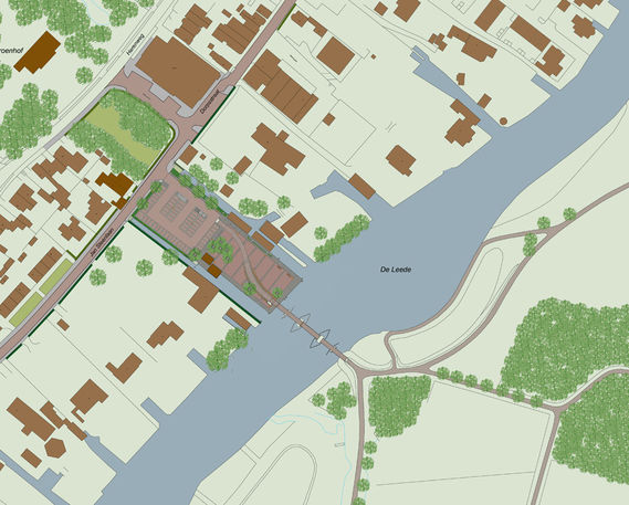 De hellingbaan van de nieuwe brug over de Leede is het beeldbepalende element op het plein. De hellingbaan loopt in een ruime bocht, waarbij het hoogteverschil wordt opgelost door houten keerwanden. Over de volle lengte van deze wanden wordt een 40 cm hoge zitrand gemaakt. Door het toevoegen van een extra trede in de binnenbocht ontstaat er een tribune met een mooi vergezicht over de Leede.