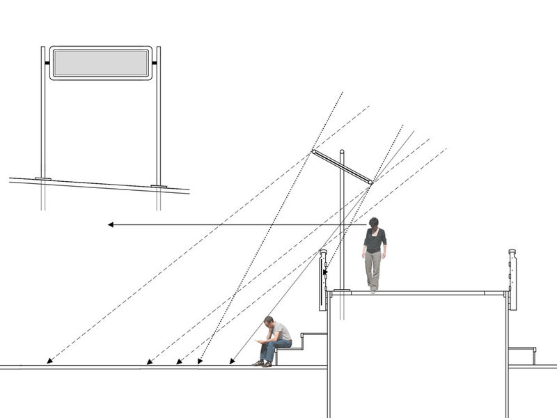 Na een uitgebreide schaduw analyse van het plein hebben wij een zo simpel mogelijke oplossing proberen te vinden. Waarbij er zowel schaduw op de brug is als zicht vanaf de brug over het plein. Het resultaat is een zonnewand tussen een deel van de leuningen van de brug en voor de zon tussen 12 en 2 uur twee zonneschermen (optioneel) achter te tribune op de brug.