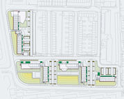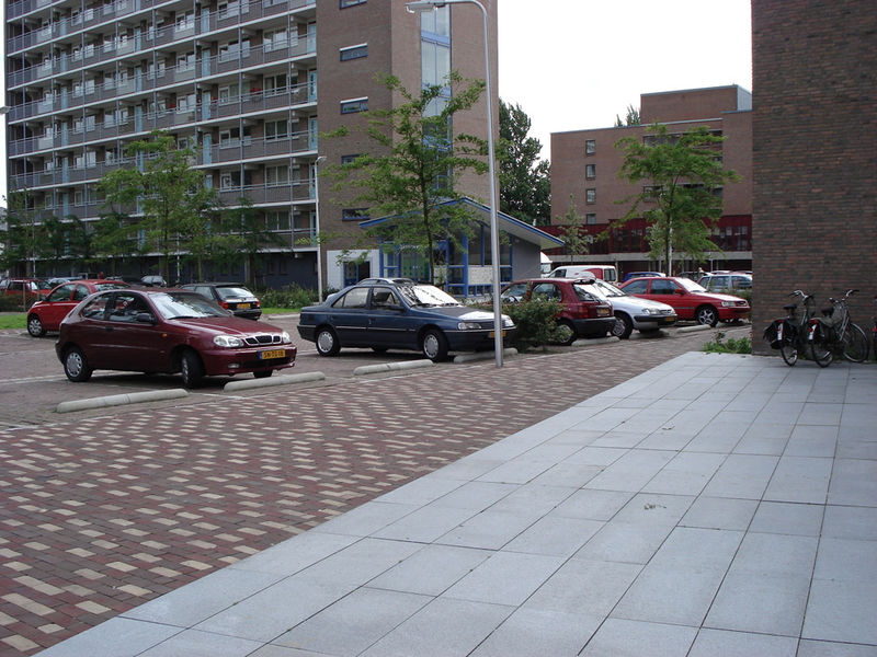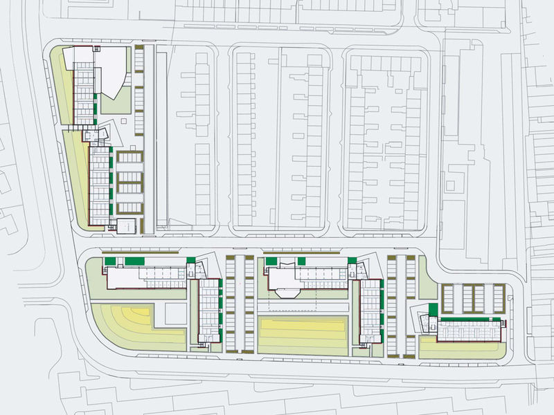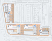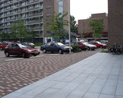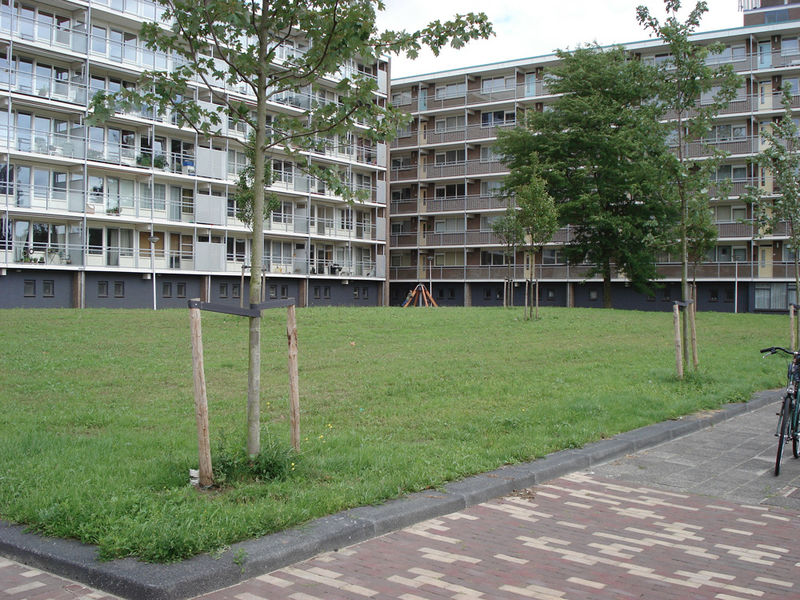 De groenstrook aan de zuidzijde wordt beter gebruikt door nieuwe ontsluitingen vanuit de trapportalen te realiseren en door de aanleg van paden en twee verblijfsplekken. Op de pleinvloer wordt ook geparkeerd tussen de hagen en onder de bomen. De kopgevels van de flats worden geheel begroeid met wilde wingerd.