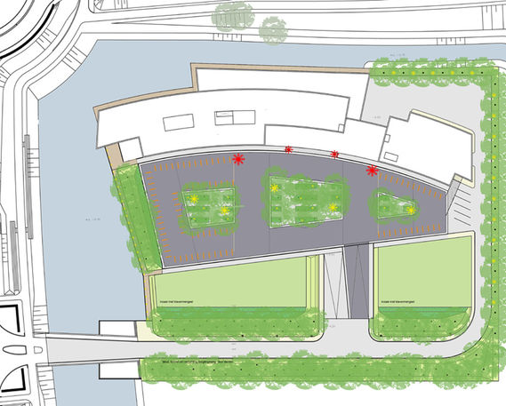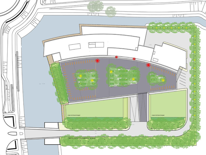 In het zwart afgewerkte dek zijn grote gaten aangebracht, omkaderd door brede lichtgrijze betonbanden. Ter plekke van de gaten zijn op de begane grond zoveel mogelijk berken geplant. De kruinen van de bomen steken door het dek en worden 's avonds van onder blauw aangelicht. Vijf hoge lichtmasten verlichten het bovendek.