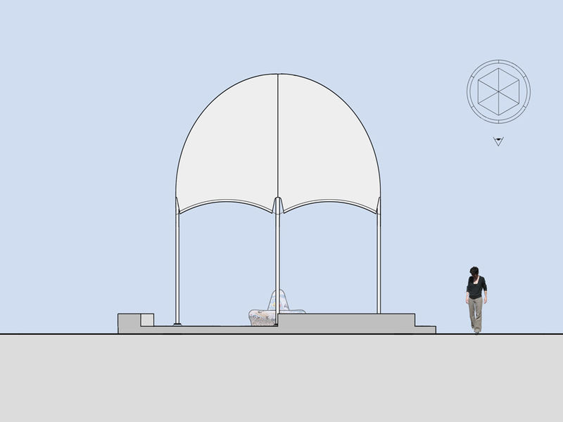 Het paviljoen wordt op een rond plateau geplaatst. Het plateau wordt met een brede betonband omzoomd en ingevuld met granietkeitjes. In het plateau worden grondspots opgenomen die de koepel van onder aanschijnen. De koepel verandert hierdoor ´s avonds in een lichtbaken tussen de bomen.